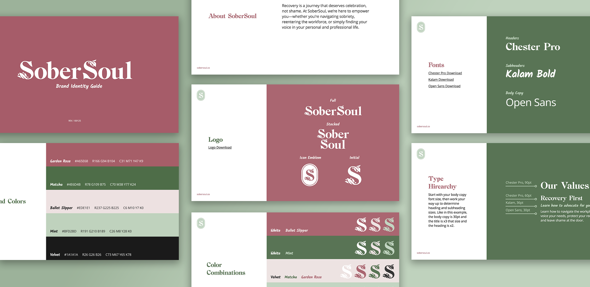 Knowing that SoberSoul was starting as a one-woman operation and most design work would be done in Canva, all deliverables were made simple. The brand identity guide was short with links to access typeface downloads and logo files, as well as some easy layout and color combination guides.