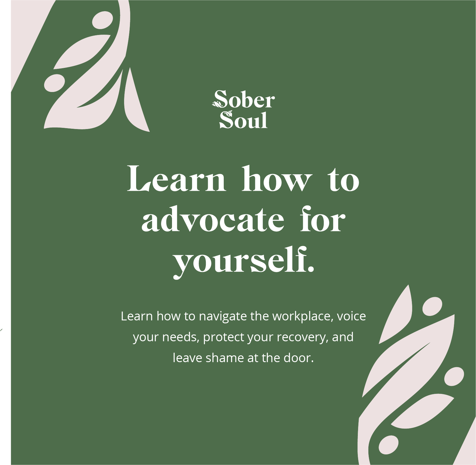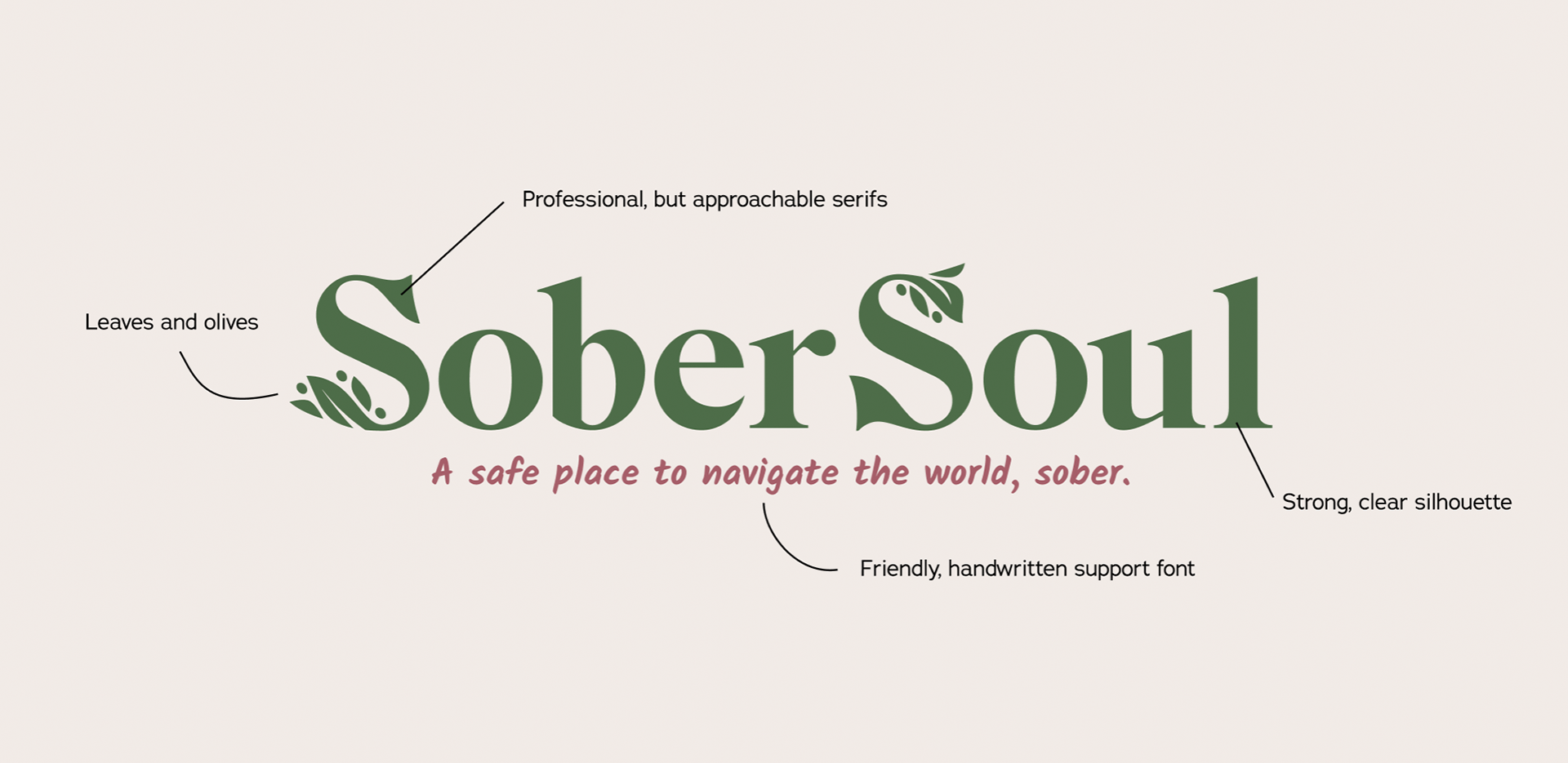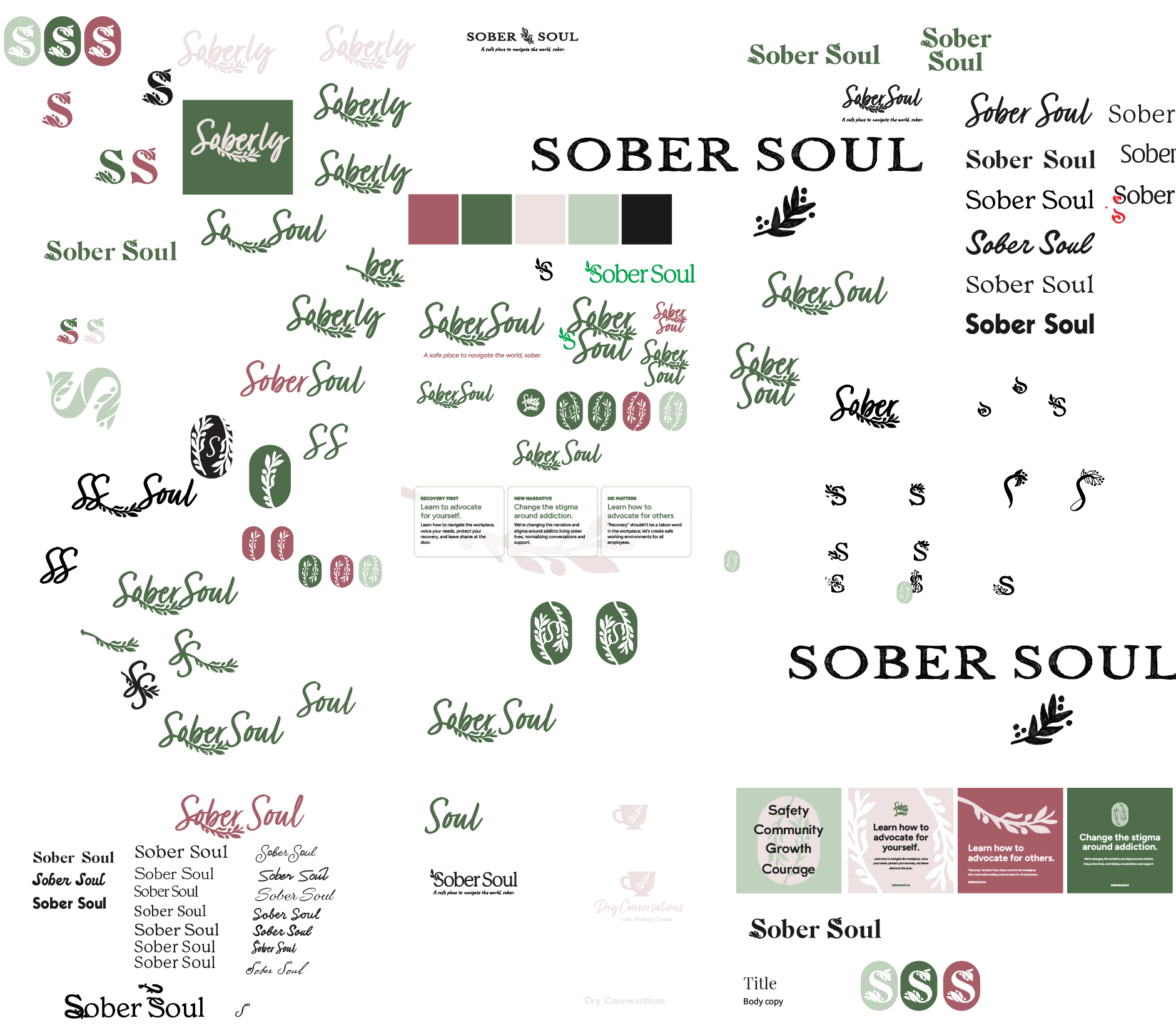 Mimicking cozy coffee shops or spring gardens, the main themes to emphasize were growth, specifically olive branches, and belonging. Soft colors and hand-written typefaces were explored, but a need for an edge of professionalism was necessary to ensure long-term value as SoberSoul grows.